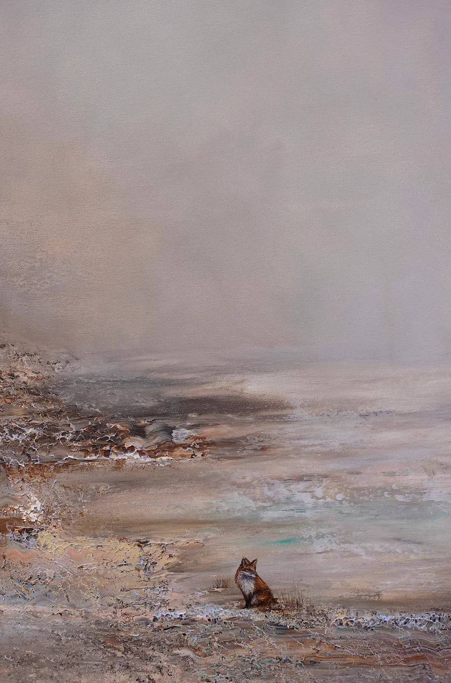 "Longing for Peace" is a serene painting featuring a small fox amidst a tranquil, abstract landscape. The neutral tones create a sense of peacefulness, while the calm cloudy sky adds to the overall serene mood of the piece. The fox symbolizes the desire for peace, and the painting captures a longing for tranquility and harmony in the world.