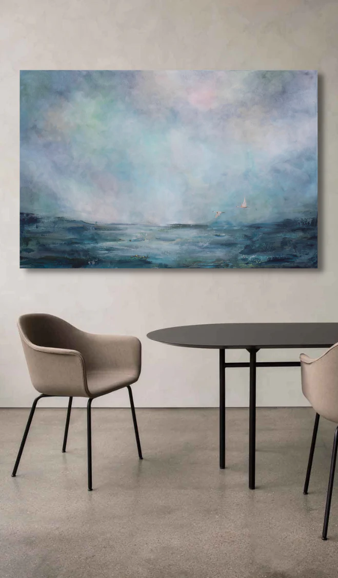 This piece is incredibly meaningful to me. The "You are enough" painting is the one that gave me the idea for this whole collection. I wanted to create something that feels hopeful and light, but with more profound emotion and deeper meaning. The journey from a blank canvas to dark colors that lightens up for every layer, the feeling of freedom with the flying swans, and the depth in the landscape reflect the journey of life.